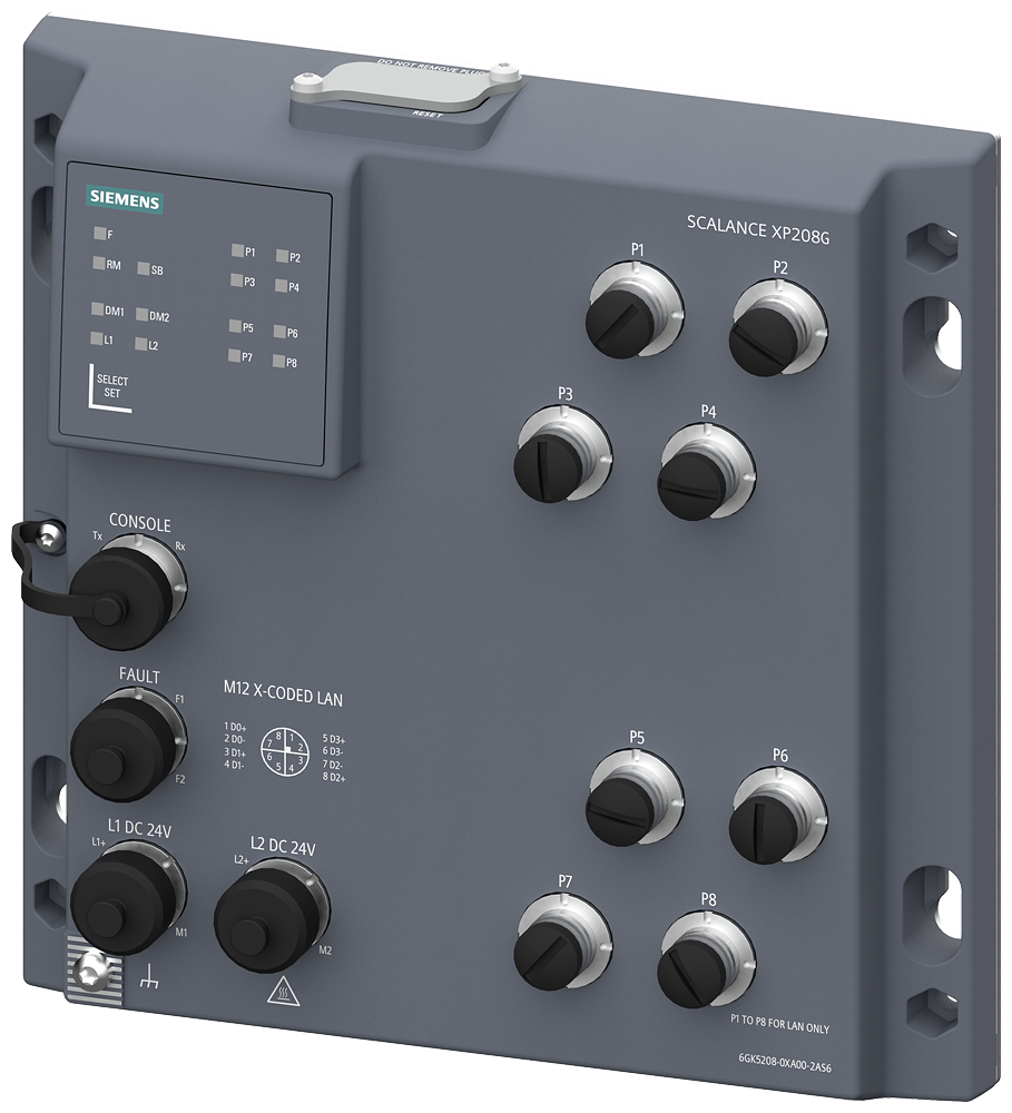 SCALANCE XP208G, IP65, managed layer 2 IE switch, 8x 100/1000 Mbps, M12 ports, LED diagnostics, error signaling contact, redundant power supply, IEC 62443-4-2 certified PROFINET IO device, network management, can be operated in redundant ring, dust caps, -40 °C to +70 °C, C-PLUG optional.