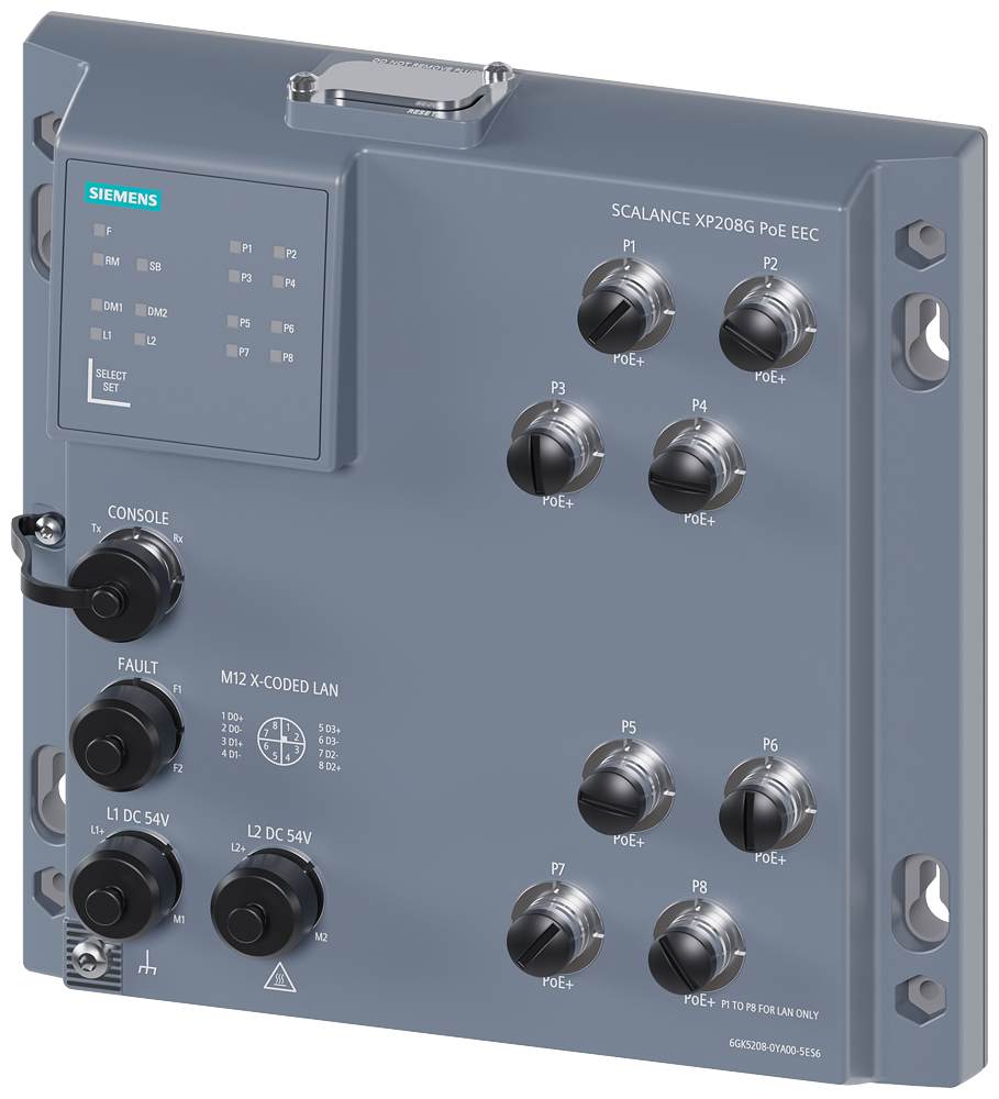 SCALANCE XP208G PoE EEC, IP65, layer 2 IE switch, 8x 100/1000 Mbps, M12 ports, 802.3at, 8x30 W (max. 240 W), LED diagnostics, error signaling contact, redundant power supply, PROFINET IO device, network management, can be operated in redundant ring, dust caps, including -40 °C to +70 °C C-PLUG optional.