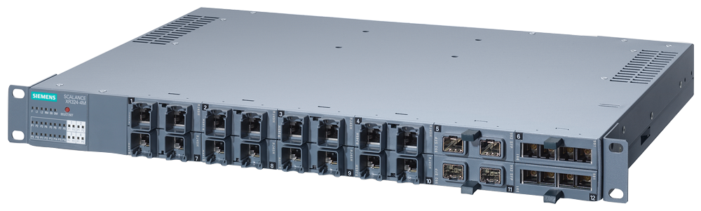 SCALANCE XR324-4M EEC; Managed IE switch, 19" rack; 16x 10/100/1000 Mbit/s for RJ45 ports electrical; 4x 100/1000 Mbit/s for 2-port media modules, electrical or optical; LED diagnostics; error signaling Contact; Select/set pushbutton, PROFINET IO device, network management, Integrated redundancy manager; Power supply 1x 230 V AC; Ports in the front