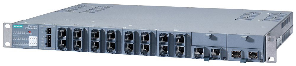 SCALANCE XR324-4M PoE TS; Managed IE switch, 19" rack; 8x 10/100/1000 Mbit/s for RJ45 ports electrical with PoE, 8x 10/100/1000 Mbit/s for RJ45 ports electrical without PoE; 4x 10/100/1000 Mbit/s 2-port media modules, electrical or optical; LED diagnostics; error signaling Contact; Select/set pushbutton, PROFINET IO device, Power supply 24 V DC; Ports in the front