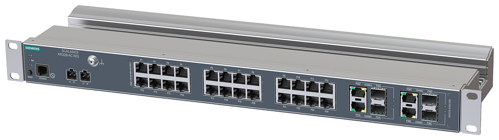 SCALANCE XR328-4C WG; managed IE switch; 19" rack; 24 x 10/100 Mbit/s electrical ports; 4 x 1000 Mbit/s combo ports electrical or optical; LED diagnostics; Reset button; console port; PROFINET Device; network management Function; redundancy manager; no UL/FM approval; Power supply 24 V DC