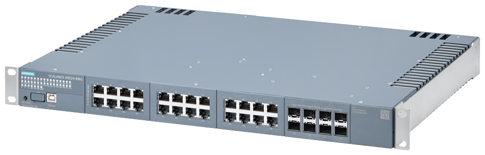 SCALANCE XR524-8WG; managed IE switch, 19" rack; 24x 10/100/1000 Mbps RJ45 port; 8x 1G/10G SFP+ port; LED diagnostics; select/set button; PROFINET IO device, network management, integrated redundancy manager, office features (RSTP, VLAN, IGMP,..) CPL not included in scope of delivery; power supply 1x 230 V AC; layer 3 integrated; layer 3 integrated