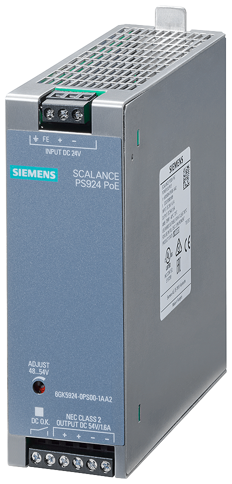 SCALANCE PS924 PoE power supply for Power-over-Ethernet, Input: 24 V DC output: 54 V DC/1.6 A NEC Class 2