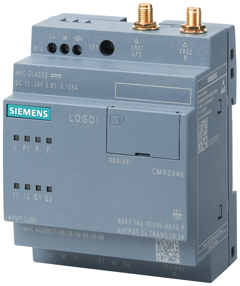 LOGO! CMR2040 COMMUNICATION MODULE FOR CONNECT. LOGO! 0BA8 TO LTE NET, 1 RJ45 PORT FOR IND.ETHERNET-CONECTION TO LOGO! 0BA8, 2XDI,2XDO, READ/WRITE-ACCESS TO LOGO! -VARIABLES, SMS SEND/RECEIVE, POSITION RECOGN. GPS, TIME SYN. /FORWAR- DING WITH REAL TIME CLOCK, CONFIG./DIAG.PER WEB-INTERFACE, NOTE NATIONAL APPROVEMENTS