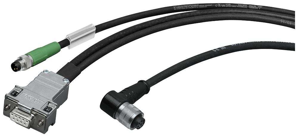 SIMATIC RF200/RF300; connecting cable, pre-assembled, between reader and PC (RS232), PUR, CMG, Trailing, Length 5 m 24 V-end w. M8 connector; reader connector angled
