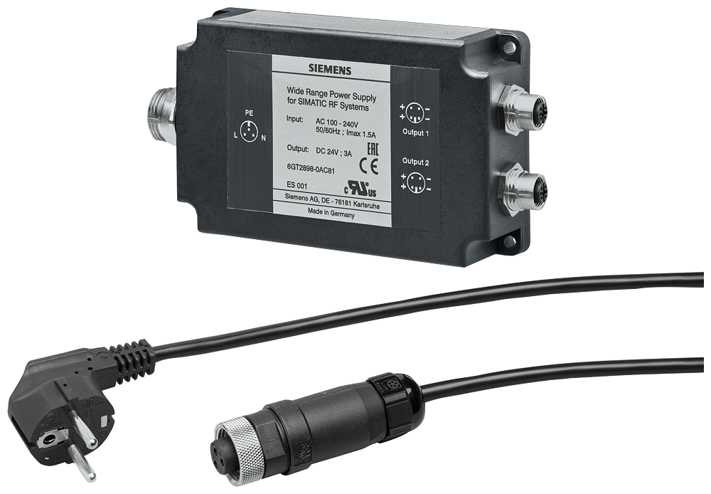 SIMATIC RF600 wide-range voltage supply for SIMATIC RF systems In: AC: 100-240 V Out: 24 V DC 3A CE, UL, CSA Degree of protection IP67 with power supply cable/connector CEE 7/7 Consisting of: 1x 6GT28980AC81 1x 6GT28980AC01