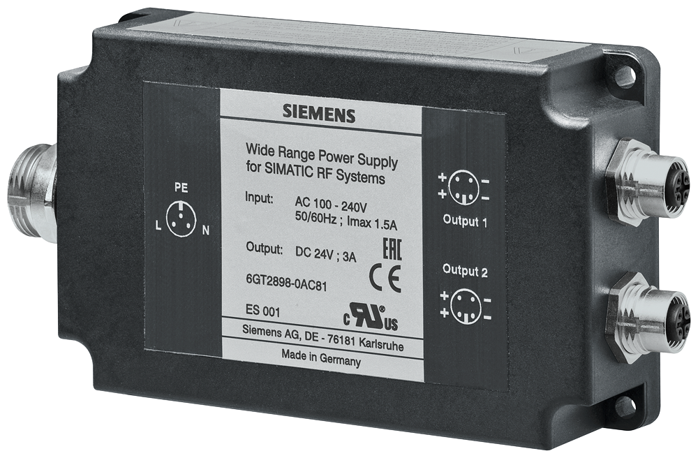 SIMATIC RF600 Wide-range voltage supply for SIMATIC RF systems In: AC: 100-240 V Out: 24 V DC 3 A CE, UL, CSA degree of protection IP 67 Without power supply cable / connector.