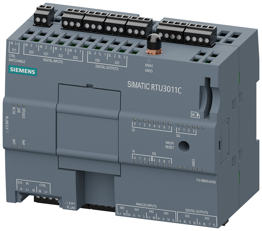 SIMATIC RTU3011C compact low-power RTU; battery or solar-operated; connection external power supply 10.8 V to 28.8 V DC; connection of external modem; GNSS; connection to TeleControl Server Basic; loadable protocols: DNP3, IEC 60870-5-104, SINAUT ST7 or MQTT; onboard I/Os: 8 DI, 8 DO, 4 AI; FTP client; configuration/diagnostics via web server; time synchronization; email; SD card slot. GNSS national approvals to be considered