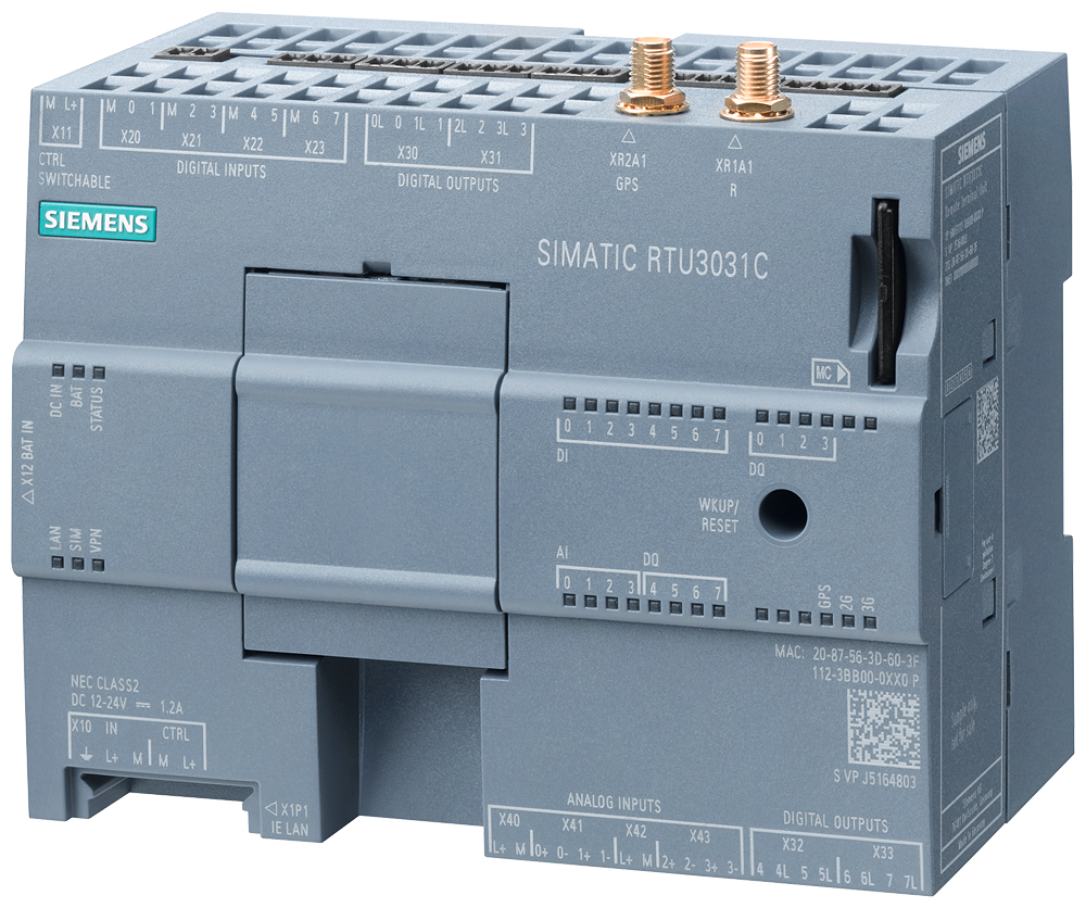 SIMATIC RTU3031C compact low-power RTU; Battery-/accumulator- or solar-operated; connection ext. power supply 10.8 V up to 28.8 V DC; integrated UMTS modem; GPS; connection to TeleControl Server Basic; DNP3- IEC 60870-5-104 and SINAUT ST7 protocols, onboard I/Os: 8 DI, 8 DQ, 4 AI; FTP client; Ethernet port, configuration / diagnostics via web server, time-of-day synchronization, SMS, e-mail, SD card slot, observe national approvals