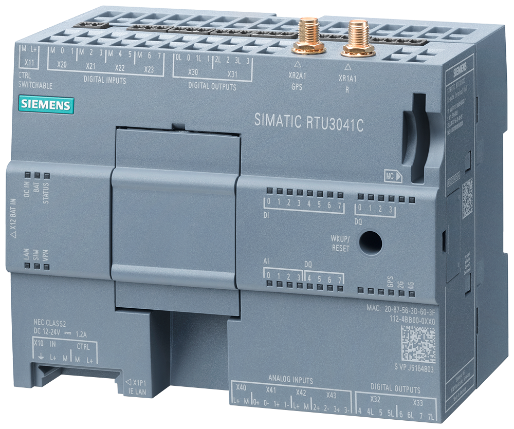 SIMATIC RTU3041C compact low-power RTU; Battery or solar-operated; Connection ext. power supply 10.8 V to 28.8 V DC; Integrated modem f. LTE-M/NB-IoT; GPS; Connection to TeleControl Server Basic, DNP3, IEC 60870-5-104 and SINAUT ST7 protocol; Onboard I/Os: 8 DI, 8 DQ, 4 AI; FTP client; Ethernet port, configuration / diagnostics via web server, time synchronization, text message, email, SD card slot, observe national approvals