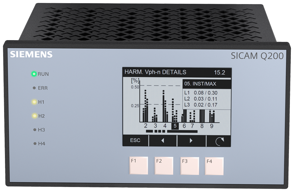 Multifunctional Power Quality Instrument SICAM Q200, PQI-A, Device dimensions (W x H x D): 192 mm x 96 mm x 134.6 mm, Panel flush-mounting device with integrated LCD display, Supply voltage: 110 V – 230 V, 4 inputs AC voltage measurement 4 inputs AC current measurement 6 binary in- & 6 binary outputs Web server for parameterization and visualization, . NTP time synchronization, . CE and UL certification, . 2 GB memory, Ethernet switch, Ethernet interface, RJ45, and communication protocol DNP3 IP, Modbus TCP and IEC 61850 server Serial interface, RS485, for Modbus RTU Gateway/Master