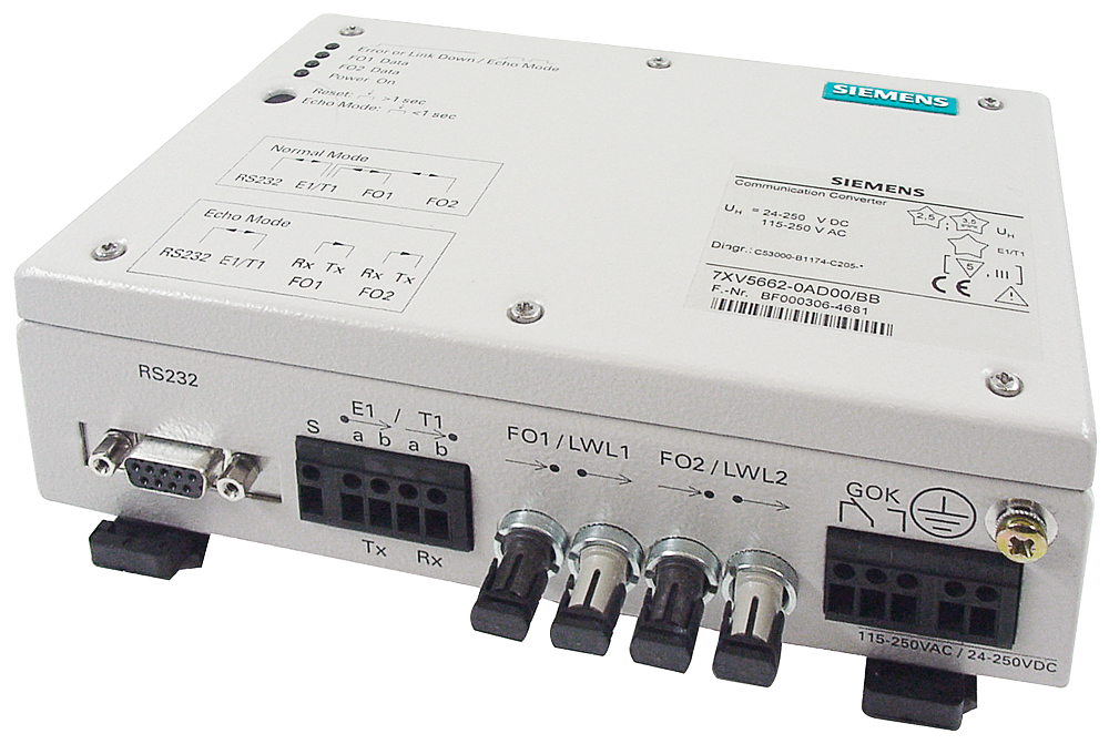 Коммуникац. конвертер синхр. или асинхр. послед. данных в коммуникац. сетевой интерфейс в формате E1 (2 Мбит/с — G703.6) или T1 (1,544 Мбит/с) электрич. выходной интерфейс через клеммн. колодку два независимых последоват. оптических входных канала с разъемами ST и 820 нм для многомодового волокна для макс. 512 кбит/115,2 кбит/с для синхронных/асинхронных данных интерфейс RS232/RS485 макс. 115,2 кбит/с (RS485 макс. 57,6 кбит/с) 9-конт. гнездо D-sub для подкл. с помощью DIGSI-кабеля 7XV5100 блок питания шир. диапазона 24–250 В DC и 115/230 В AC