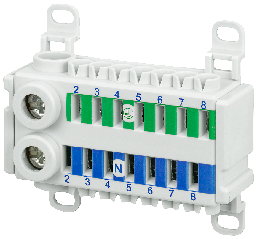 ALPHA 400-ZS N/PE terminal 14-pole, 2x 14 mm2 screw terminals 14x 4 mm2 plug-in terminals, horizontal installation or vertically on DIN rail, color blue/green