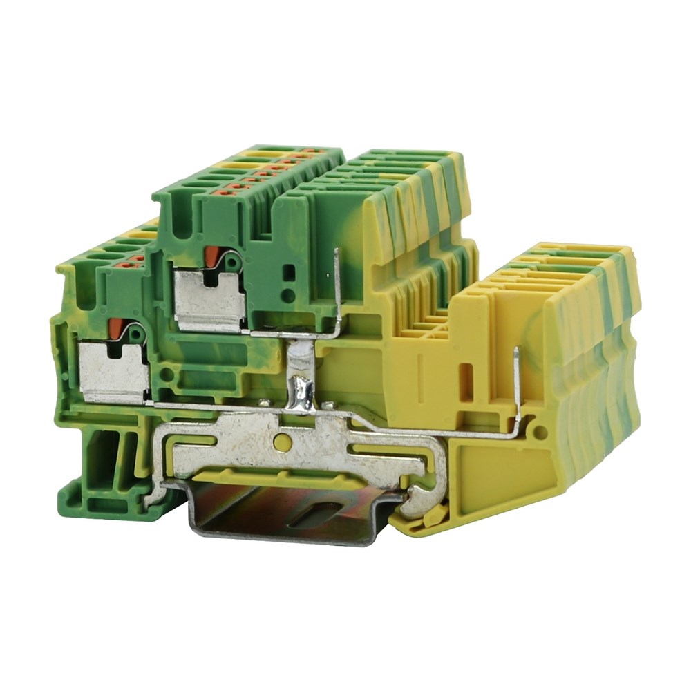 Двухъярусная заземляющая клемма с разъемным подключением, количество точек подсоединения: 4, тип подключения: разъемное подключение / Push-in, 2 уровня, сечение: 0,2 мм² - 4 мм², тип монтажа: РМ-35/7,5, РМ-35/15, цвет: желто-зеленый