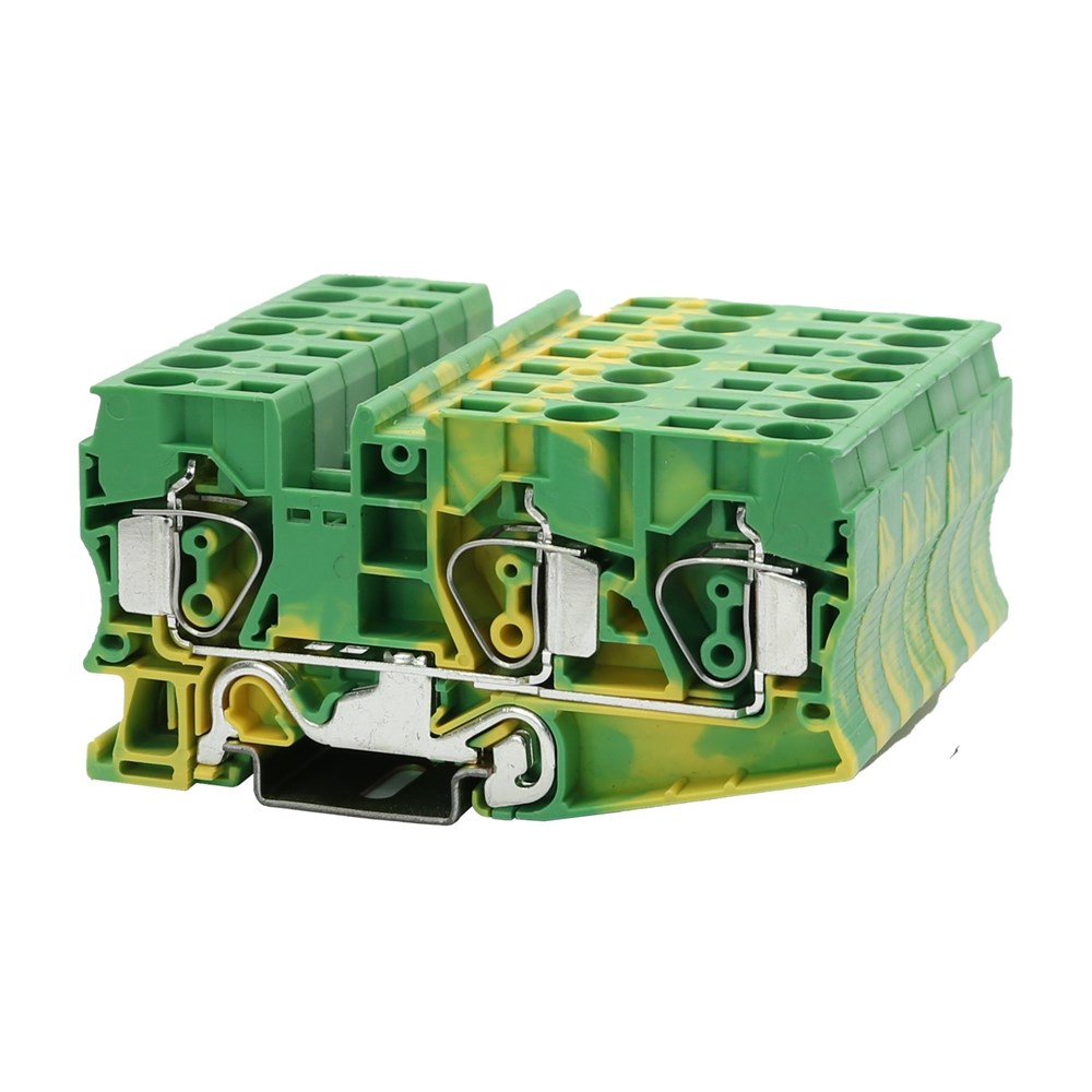 Заземляющая клемма с пружинными зажимами, количество точек подсоединения: 3, тип подключения: пружинный зажим, 1 уровень, расчетное сечение: 10 мм², сечение: 0,5 мм² - 16 мм², тип монтажа: РМ-35/7,5, РМ-35/15, цвет: желто-зеленый