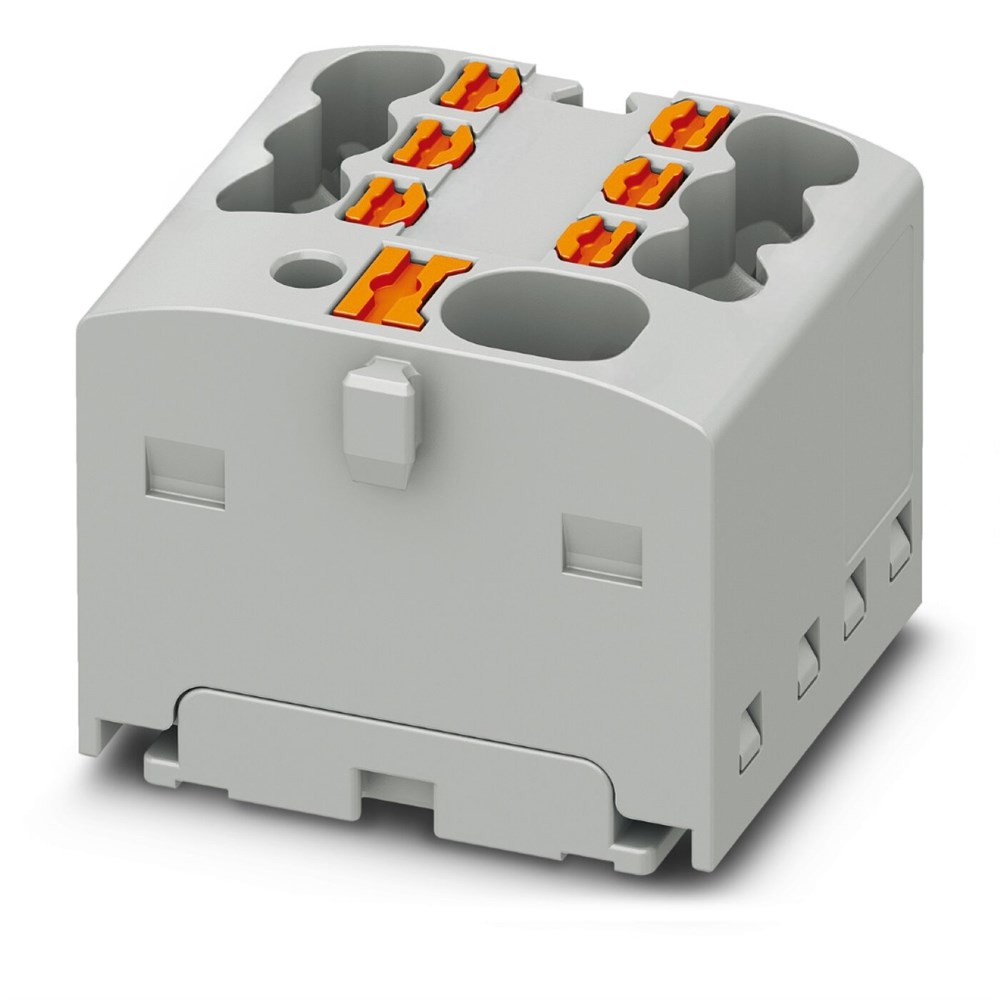 Распределительный блок, базовая клемма с питанием, номинальное напряжение: 450 В, номинальный ток: 17,5 A, тип подключения: зажимы Push-in, отвод, сечение: 0,2 мм² - 2,5 мм², групповое подключение, расчетное сечение: 4 мм², сечение: 0,2 мм² - 6 мм², тип монтажа: крепление защелками на адаптере для монтажной рейки, прямой монтаж при помощи фланца, подвесной, цвет: серый