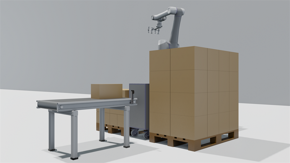 Робот при помощи датчика распознает движущиеся по конвейеру объекты, поочередно захватывает их и размещает на рядом стоящую паллету, таким образом равномерно заполняя её. Можно запрограммировать робота для различных алгоритмов укладки продукции на поддон (задать разные сценарии для четных и нечетных слоев продукции).