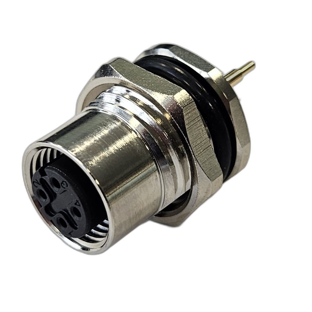 Разъем М12, кодировка 4D, гнездовой, пайка на печатную плату, металлический корпус, прямой, резьба M16, приборная часть